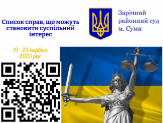 Зарічний районний суд м. Суми інформує про справи, які розглядатимуться 19.06.2023 – 23.06.2023 та можуть становити суспільний інтерес.