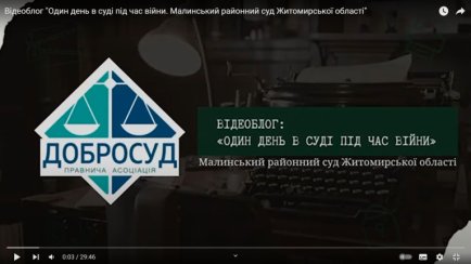 Пропонуємо до уваги відеосюжет Правничої асоціації "ДОБРОСУД" - "Один день в суді під час війни. Малинський районний суд Житомирської області".