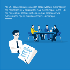 Верховний Суд виснував, що положення ст. 99 ЦК України та ст. 39 Закону України «Про товариства з обмеженою та додатковою відповідальністю» щодо права учасників товариства припинити повноваження виконавчого органу в будь-який час не звільняють учасників товариства від дотримання порядку скликання загальних зборів та, відповідно, належного повідомлення всіх учасників товариства про проведення таких зборів.