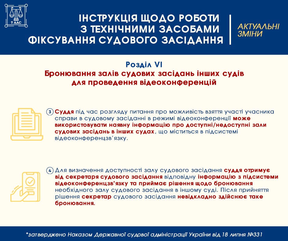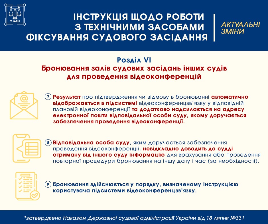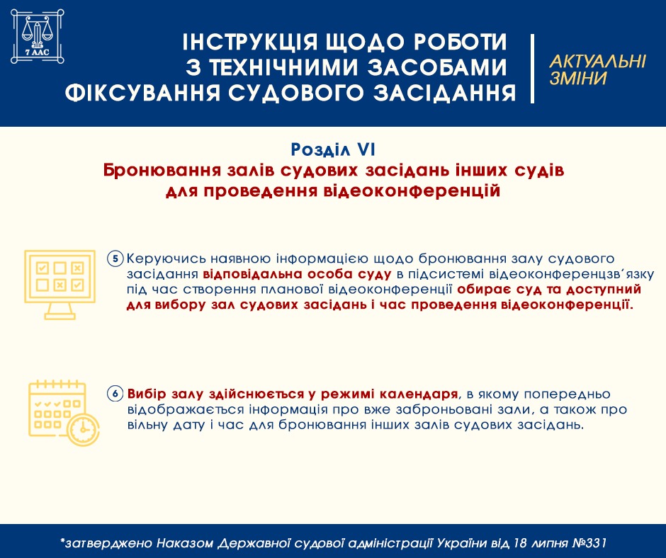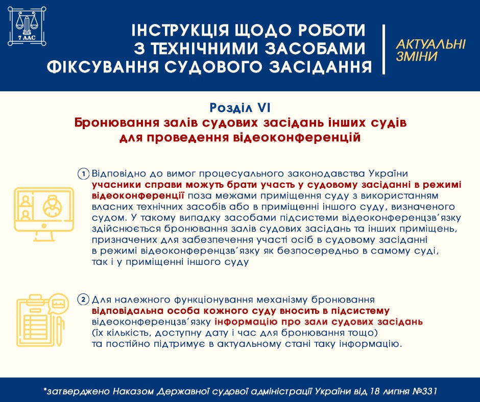 Так, Інструкцію щодо роботи з технічними засобами фіксування судового засідання, затверджена наказом Державної судової адміністрації України від 06.06.2022 № 156, доповнили новим розділом VI «Бронювання залів судових засідань інших судів для проведення відеоконференції».