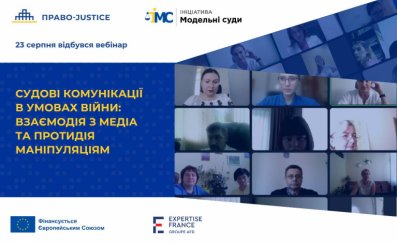 23 серпня Проєкт ЄС "Право-Justice" у співпраці з ГО "Всеукраїнська асоціація працівників судів" організували вебінар "Судові комунікації в умовах війни: взаємодія з медіа та протидія маніпуляціям". Захід відбувся у межах Ініціативи "Модельні Суди". Слухачами вебінару стали судді та працівники апаратів судів.