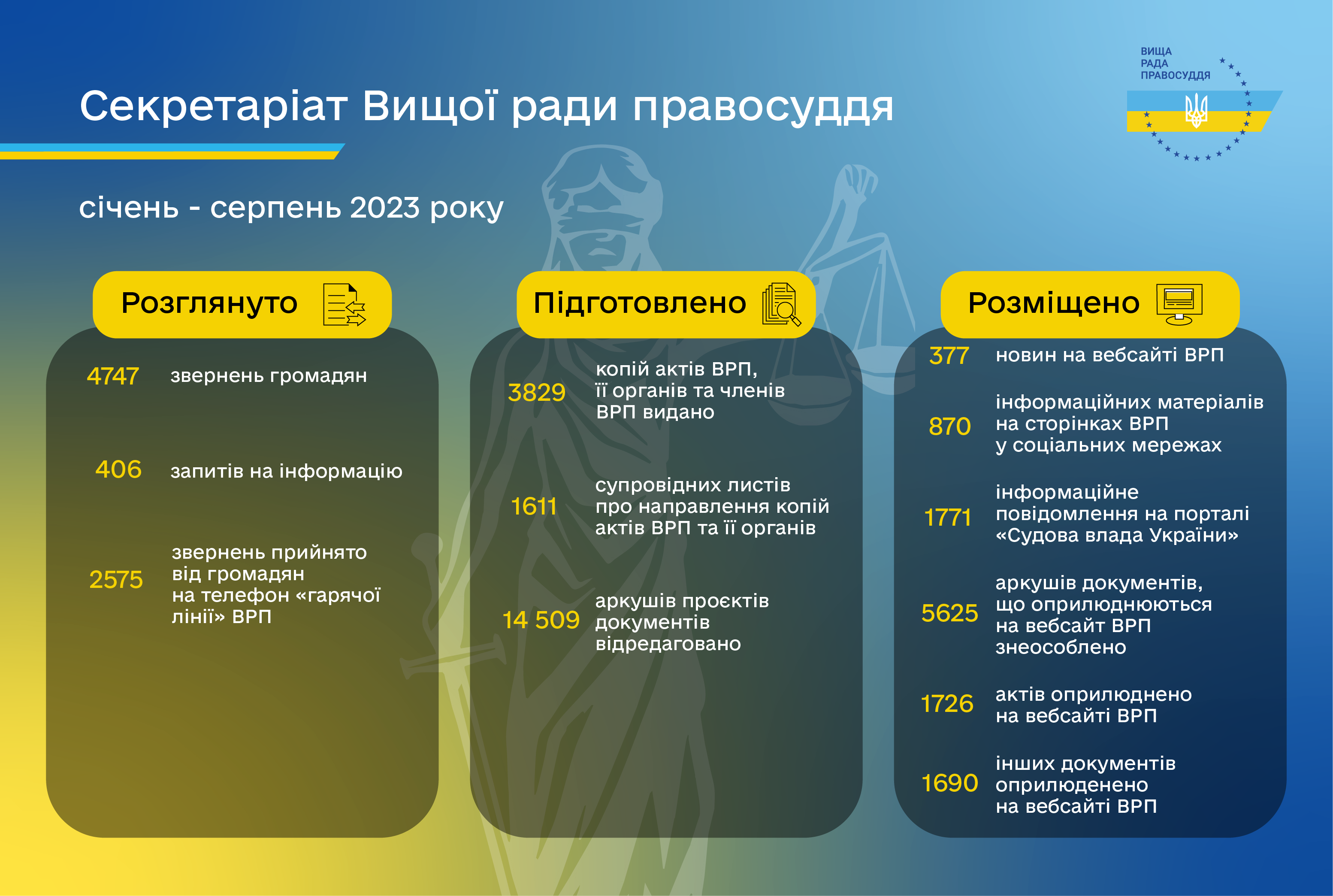 На офіційному вебсайті Вищої ради правосуддя упродовж січня - серпня 2023 року оприлюднено 1726 актів ВРП, 1690 інших документів, 377 новин; у соціальних мережах ВРП розміщено 870 інформаційних матеріали.