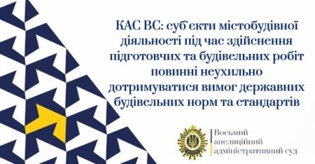 За результатами касаційного перегляду справи № 813/5770/15 колегія суддів Касаційного адміністративного суду у складі Верховного Суду (далі – КАС ВС) погодилася з висновками Восьмого ААС, що значення конституційних положень у сфері захисту права власності у сфері будівництва полягає в обов`язку суб`єктів містобудівної діяльності під час здійснення підготовчих та будівельних робіт неухильно дотримуватися вимог, зокрема, законів України «Про регулювання містобудівної діяльності», «Про архітектурну діяльність», «Про благоустрій населених пунктів», вимог державних будівельних норм та стандартів, містобудівної документації на місцевому рівні.