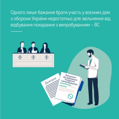 На час касаційного розгляду кримінального провадження щодо порушення правил безпеки дорожнього руху, що призвело до смерті потерпілого, засуджений не надав жодних даних про зарахування його до Збройних Сил України чи інших військових формувань, які б підтвердили щирість і реальність його наміру брати участь у воєнних діях з оборони України, як про це він та його захисник заявляли в судах попередніх інстанцій. А одного тільки бажання засудженого, без документального підтвердження, недостатньо для того, щоб звільнити його від відбування покарання з випробуванням.