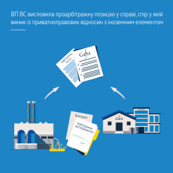 Спір, який виник із приватноправових відносин з іноземним елементом між юридичними особами, зареєстрованими в Україні, може бути переданий на вирішення іноземного арбітражу за положеннями Конвенції ООН про визнання та виконання іноземних арбітражних рішень 1958 року (Конвенція), законів України «Про міжнародне приватне право» та «Про міжнародний комерційний арбітраж» з урахуванням обмежень, які встановлює внутрішнє законодавство, зокрема норми процесуального закону про виключну юрисдикцію українських судів.