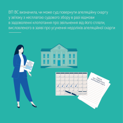 Тож, на переконання ВП ВС, апеляційний суд, ухваливши рішення про відмову у звільненні позивачки від сплати судового збору, мав постановити відповідну ухвалу, направити її позивачці та переконатися, що вона отримала цю ухвалу й має розумний строк для сплати судового збору та подання заяви про продовження або поновлення строку на усунення недоліків разом з доказами сплати судового збору. Відповідно до ч. 6 ст. 260 ГПК України строк постановлення ухвали не повинен перевищувати п’яти днів із дня закінчення строку на усунення недоліків.