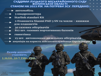 Суддями Луцького міськрайонного суду Волинської області протягом 2023 року на потреби Збройних Сил України передано, зокрема: