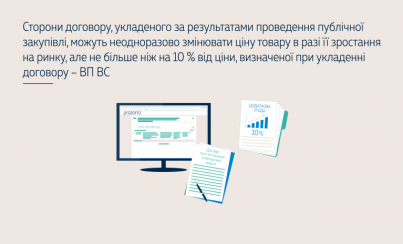 Під час дії договору про закупівлю сторони можуть неодноразово змінювати ціну товару в бік збільшення за наявності умов, установлених у ст. 652 ЦК України та п. 2 ч. 5 ст. 41 Закону України «Про публічні закупівлі», проте загальне збільшення такої ціни не повинне перевищувати 10 % від ціни товару, яка була визначена сторонами при укладенні договору за результатами процедури закупівлі.