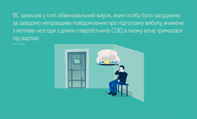 У цій справі за вироком місцевого суду, залишеним без зміни апеляційним судом, особу визнано винуватою в тому, що вона, перебуваючи в слідчому ізоляторі, двічі зателефонувала з мобільного телефону диспетчеру спецлінії «102» Національної поліції України та анонімно повідомила завідомо неправдиву інформацію про підготовку вибухів, а саме замінування будівель аеропорту, залізничного вокзалу й автовокзалу, що загрожувало громадській безпеці (ч. 1 ст. 259 КК України).