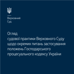 Ознайомитись з оглядом судової практики за 2022–2023 роки, у якому містяться релевантні висновки Верховного Суду у прив’язці до конкретних статей ГПК України у форматі «запитання – відповідь» можна за посиланням: https://supreme.court.gov.ua/userfiles/media/new_folder_for_uploads/supreme/ogliady/Oglyad_KGS_pol_GPK_02_2022_12_2023.pdf