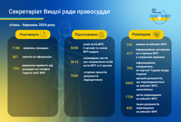 На офіційному вебсайті Вищої ради правосуддя упродовж січня - березня 2024 року оприлюднено: 1726 актів ВРП, 635 інших документів, близько 200 новин та повідомлень; у соціальних мережах ВРП розміщено 417 інформаційних матеріалів.
