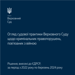 Розуміючи важливість формування єдності судової практики щодо кримінальних правопорушень, пов’язаних з війною, Верховний Суд систематизував висновки з цих питань та відобразив їх у тематичному огляді – https://supreme.court.gov.ua/userfiles/media/new_folder_for_uploads/supreme/ogliady/Oglyad_VS_war_2022_2024.pdf.
