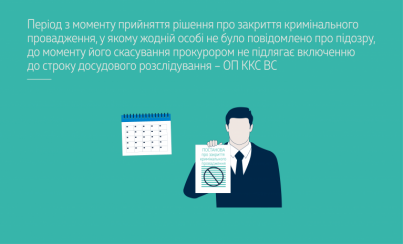 У разі скасування прокурором постанови слідчого, дізнавача чи прокурора про закриття кримінального провадження, у якому жодній особі не було повідомлено про підозру, у зв’язку з її незаконністю та необґрунтованістю період з моменту ухвалення постанови про закриття кримінального провадження до моменту її скасування не включається до строку досудового розслідування.