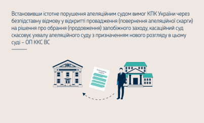 ОП ККС ВС наголосила, що практика, коли суд касаційної інстанції, за наявності обґрунтованих підстав для скасування судового рішення та призначення нового розгляду в суді апеляційної інстанції, залишає незаконне рішення без змін або скасовує його, проте не призначає нового розгляду в суді апеляційної інстанції, нівелює право обвинуваченого на оскарження рішення про обрання чи про продовження запобіжного заходу в порядку, передбаченому КПК України, та всупереч прямим приписам закону створює правовий стан, що унеможливлює для особи, права якої порушено, отримати юридичну сатисфакцію за незаконне позбавлення волі. Це може призвести в конкретному провадженні до того, що жодне з рішень про обрання чи продовження запобіжного заходу внаслідок необґрунтованого повернення апеляційної скарги не буде перевірено в апеляційному порядку та особа, усупереч установленому в статтях 331, 395 КПК України порядку, буде фактично позбавлена доступу до правосуддя.