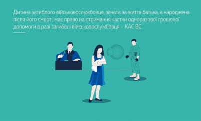 Дитина загиблого військовослужбовця, зачата за життя загиблого (померлого) та народжена після його смерті, у розумінні ст. 16-1 Закону України «Про соціальний і правовий захист військовослужбовців та членів їх сімей» належить до кола осіб, які мають право на призначення та отримання одноразової грошової допомоги у зв’язку із загибеллю військовослужбовця (15 000 000 грн).