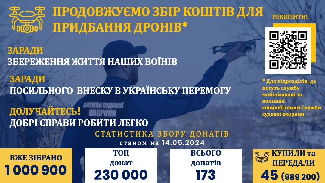 Заради посильного внеску в українську Перемогу, профспілки Служби судової охорони було ініційовано збір коштів для придбання дронів в рамках проєкту «Армія дронів» для Сил оборони, які передавались для потреб підрозділів, де несуть службу мобілізовані та колишні співробітники Служби судової охорони. Станом на сьогодні зібрано понад мільйон гривень. Співробітники Служби судової охорони з перших днів повномасштабного вторгнення непохитно боронять нашу свободу у складі підрозділів українського війська. На жаль, в колективі Служби судової охорони є втрати – 23 судових охоронці віддали свої життя за Україну у боротьбі з ворогом. Служба судової охорони продовжує збирати кошти для підтримки українських військових і надалі. |