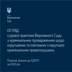 Це видання підготовлено за результатами проведеного узагальнення судової практики касаційної інстанції відповідно до підпункту 3.3.1.3.1 п. 3.3.1.3 очікуваного стратегічного результату проблеми 3.3.1 підрозд. 3.3 «Кримінальна відповідальність» розд. 3 «Забезпечення невідворотності відповідальності за корупцію» Державної антикорупційної програми на 2023–2025 роки, затвердженої постановою Кабінету Міністрів України від 4 березня 2023 року № 220.