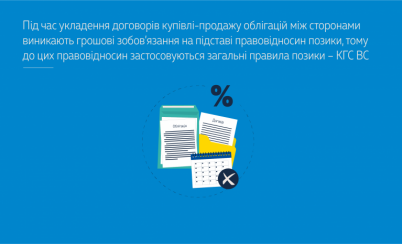 Тож Верховний Суд виснував, що у зв’язку з укладанням між ПАТ і Державною іпотечною установою договорів купівлі-продажу цінних паперів суд апеляційної інстанції дійшов правильних висновків, що між позивачем та відповідачем виникли грошові зобов’язання на підставі правовідносин позики. До правовідносин, що склалися між сторонами спору, повинні застосовуватися загальні правила позики, зокрема ті, які визначені в § 1 гл. 71 ЦК України, з урахуванням особливостей відносин, що виникають під час розміщення, обігу цінних паперів.