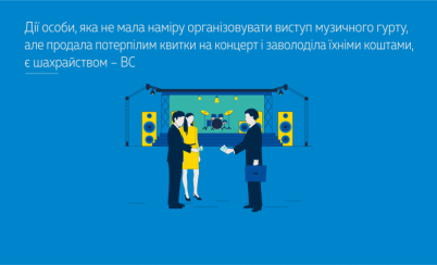 У цій справі особа обвинувачувалася в тому, що, не маючи наміру організовувати виступ музичного гурту, повідомила іншим особам про здійснення такої організації та продала квитки на концерт, а отриманими грошима заволоділа, розпорядившись ними на власний розсуд. Місцевий суд визнав винуватим і засудив обвинуваченого за частинами 1 та 2 ст. 190 КК України. Апеляційний суд погодився з місцевим судом у частині доведеності вини та правильності кваліфікації дій обвинуваченого.