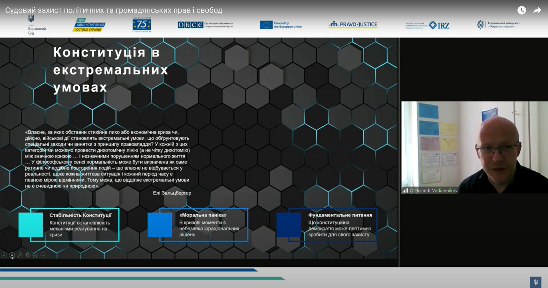 Старший проєктний співробітник Програми підтримки ОБСЄ для України Олександр Водянніков ознайомив учасників конференції з темою «Jus post bellum: конституція і людські права у період повоєнної нормалізації». Він пояснив, що концепцію jus post bellum можна розуміти як особливий режим у конституційному правопорядку в період повернення від надзвичайного режиму періоду воєнного стану до нормального урядування. Для України труднощі полягатимуть у тому, що в історії повоєнної Європи й демократичного світу немає жодного прецеденту, який би показав, яким чином має відбуватися відновлення нормального функціонування конституційного ладу. Олександр Водянніков резюмував, що перехід від конституціоналізму воєнного часу до конституціоналізму нормального часу буде дуже складним, і в цей період можуть застосовуватися певні рішення, які будуть виправдані загальною ідеєю відновлення нормального функціонування демократичних інституцій в Україні.