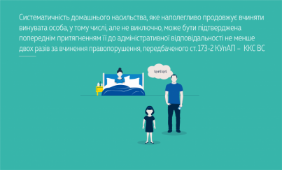 ККС ВС звернув увагу на те, що систематичність домашнього насильства, яке наполегливо продовжує вчиняти винувата особа, у тому числі, але не виключно, може бути підтверджена попереднім притягненням її до адміністративної відповідальності не менше двох разів за вчинення правопорушення, передбаченого ст. 173-2 КУпАП. Оскільки шкода фізичному або психологічному здоров’ю особи як наслідок адміністративного правопорушення, передбаченого ст. 173-2 КУпАП, не охоплюється поняттям «фізичні або психологічні страждання, втрата працездатності, емоційна залежність, погіршення якості життя потерпілої особи», що є наслідком кримінально караних діянь, визначених ст. 126-1 КК України, то попереднє притягнення особи до адміністративної відповідальності за вчинення домашнього насильства за умови подальшої повторюваності вчинення протиправних дій стосовно певної потерпілої особи чи осіб і настання конкретних наслідків, визначених законодавцем як більш тяжкі, не може свідчити про подвійне притягнення до юридичної відповідальності одного виду за те саме правопорушення.