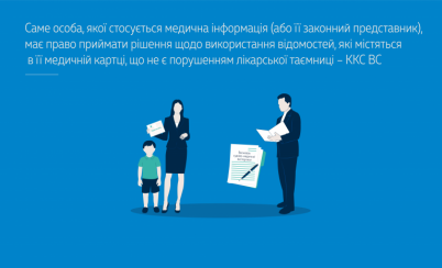Як зазначив ККС ВС, фактично всі дані, що містяться в медичній картці, є інформацією про пацієнта і за бажанням пацієнта чи його законного представника вочевидь мають бути їм надані. Подальше вирішення питання про використання цих відомостей особою, якої вони стосуються (або її законним представником), є виключно її правом.