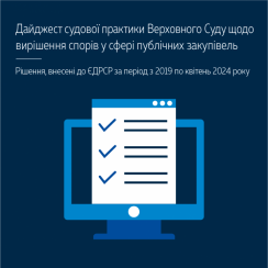 До уваги дайджест судової практики Верховного Суду щодо вирішення спорів у сфері публічних закупівель (рішення, внесені до ЄДРСР, з 2019 року по квітень 2024 року) – https://supreme.court.gov.ua/userfiles/media/new_folder_for_uploads/supreme/ogliady/Daidgest_publ_zakypivli.pdf.