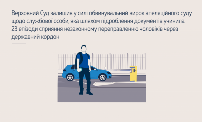 За матеріалами справи службова особа шляхом підроблення документів сприяла незаконному переправленню осіб чоловічої статі у віці від 18 до 60 років через державний кордон, учинивши 23 епізоди злочинів, передбачених ч. 2 ст. 332 та ч. 1 ст. 366 КК України. Крім того, засуджений з корисливих мотивів, діючи з прямим умислом на незаконне збагачення, свідомо погодився отримати від особи обіцяну неправомірну вигоду в сумі 1000 доларів США для себе за сприяння в наданні дозволу на виїзд за кордон і внесення персональних даних останньої до інформаційної системи «Шлях», учинивши таким чином злочин, передбачений ч. 3 ст. 368-3 КК України.