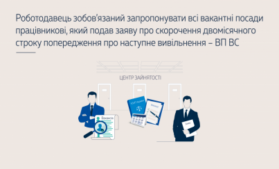Як зазначила ВП ВС, на прохання працівника роботодавець може скоротити строк попередження про наступне його звільнення (два місяці) і такого працівника може бути звільнено за п. 1 ч. 1 ст. 40 КЗпП України. Водночас скорочення зазначеного строку не впливає на виниклі у зв’язку зі зміною в організації праці гарантії працівника при вивільненні та не звільняє роботодавця від виконання обов’язку з працевлаштування працівника.