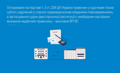 Зокрема, ВП ВС зазначила, що за недійсності правочину взаємне повернення сторонами одержаного за ним (двостороння реституція) є юридичним обов’язком, що виникає із закону та юридичного факту недійсності правочину.