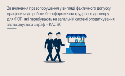 За вчинення правопорушення у вигляді фактичного допуску працівника до роботи без оформлення трудового договору фізичні особи – підприємці, які є платниками єдиного податку першої – третьої груп, несуть відповідальність у вигляді попередження (абз. 2 ч. 2 ст. 265 КЗпП України). Водночас для фізичних осіб – підприємців, які перебувають на загальній системі оподаткування, за вчинення такого правопорушення законом передбачена санкція у вигляді штрафу.