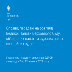 Цього тижня знайомимо вас зі справами, переданими на розгляд Великої Палати Верховного Суду, об’єднаних та судових палат касаційних судів відповідно до ухвал про передачу, внесених до ЄДРСР із 7 по 13 жовтня 2024 року.