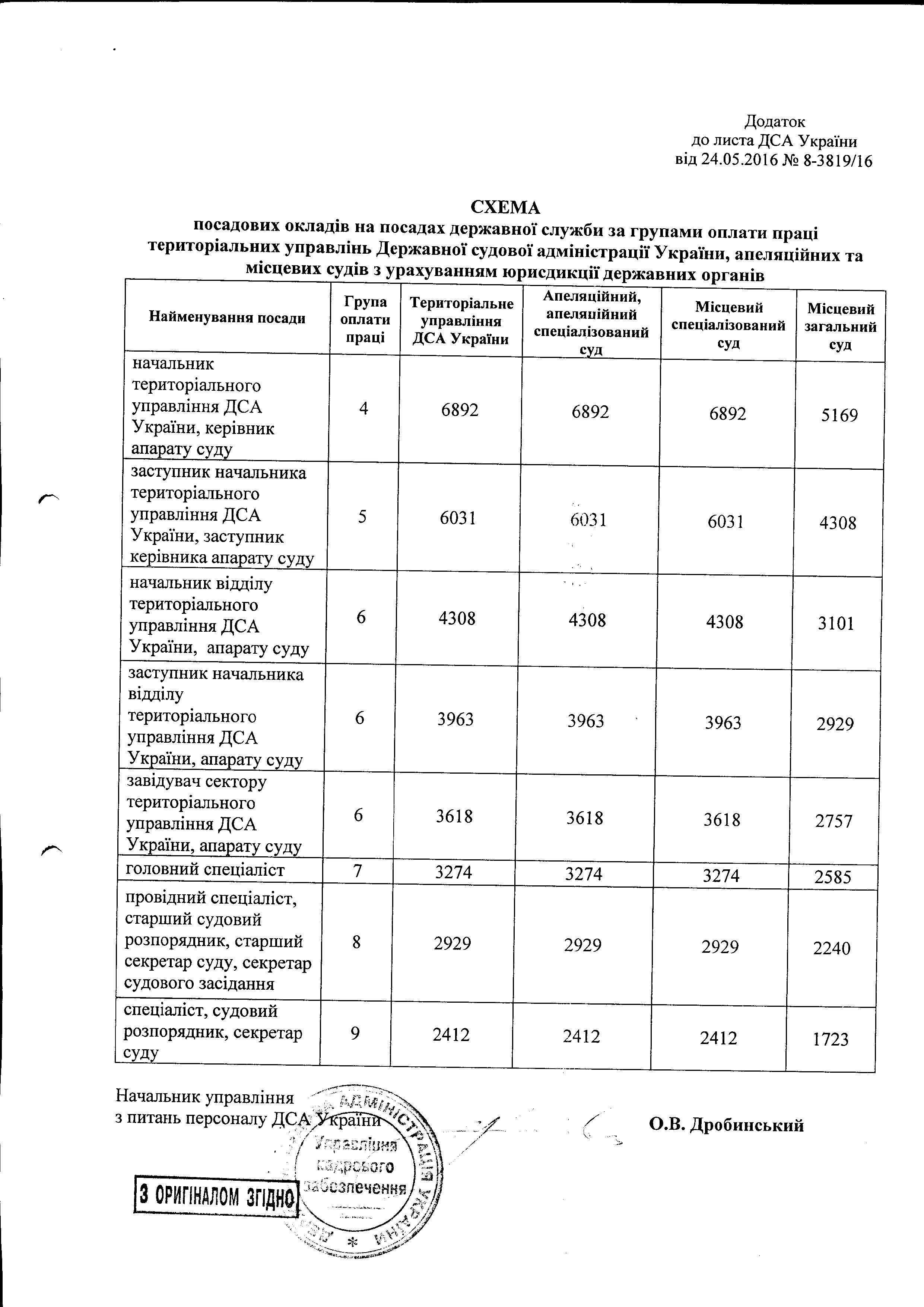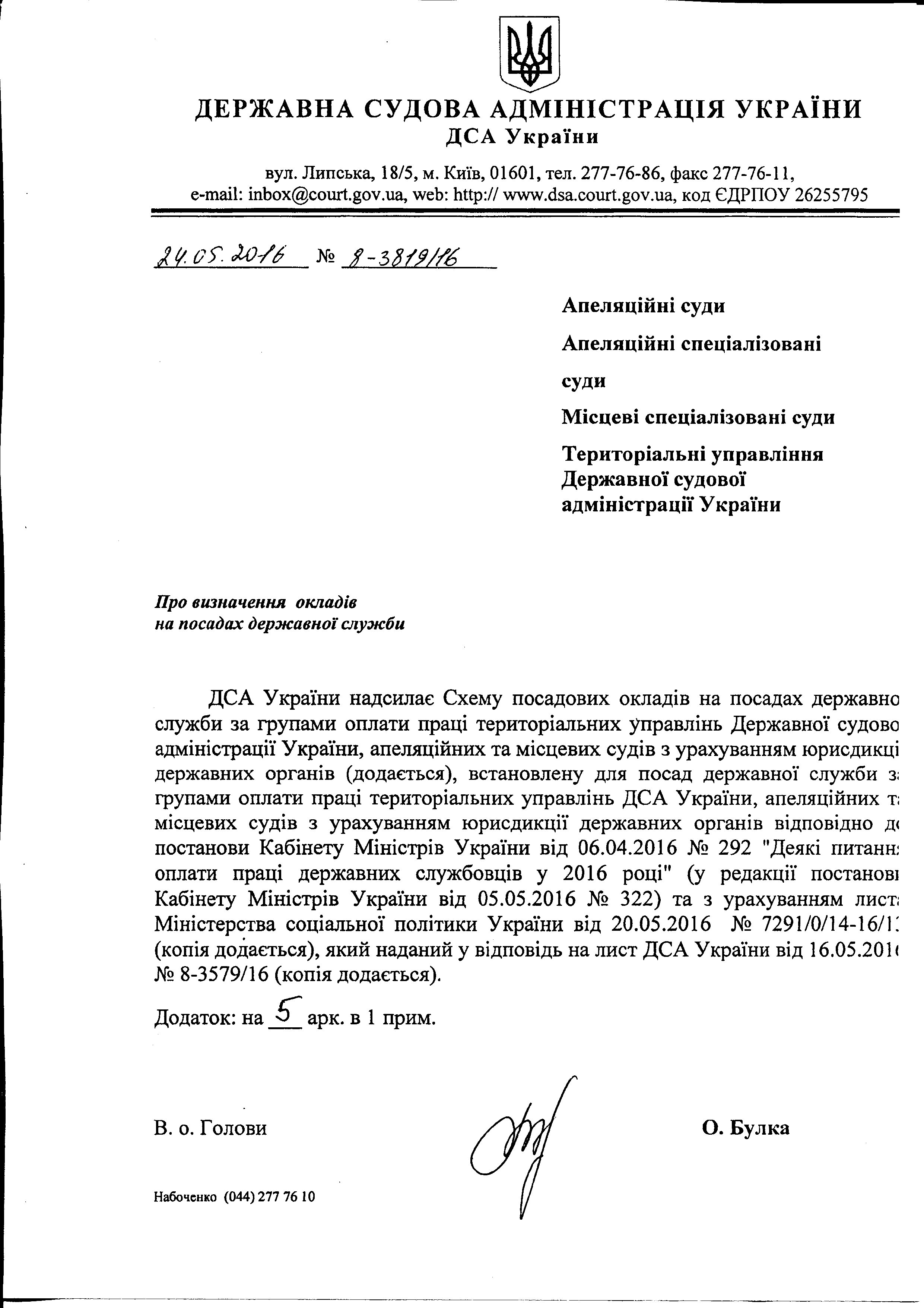 Державною судовою адміністрацією України направлено місцевим та апеляційним судам загальної юрисдикції, а також територіальним управління ДСА України Схему посадових окладів на посадах державної служби за групами оплати праці територіальних управлінь Державної судової адміністрації України, апеляційних та місцевих судів з урахуванням юрисдикції державних органів, встановлену для посад державної служби за групами оплати праці територіальних управлінь ДСА України, апеляційних та місцевих судів з урахуванням юрисдикції державних органів відповідно до постанови Кабінету Міністрів України від 06.04.2016 № 292 "Деякі питання оплати праці державних службовців у 2016 році" (у редакції постанови Кабінету Міністрів України від 05.05.2016 № 322) та з урахуванням листа Міністерства соціальної політики України від 20.05.2016 № 7291/0/14-16/13, який наданий у відповідь на лист Державної судової адміністрації України від 16.05.2016 № 8-3579/16.