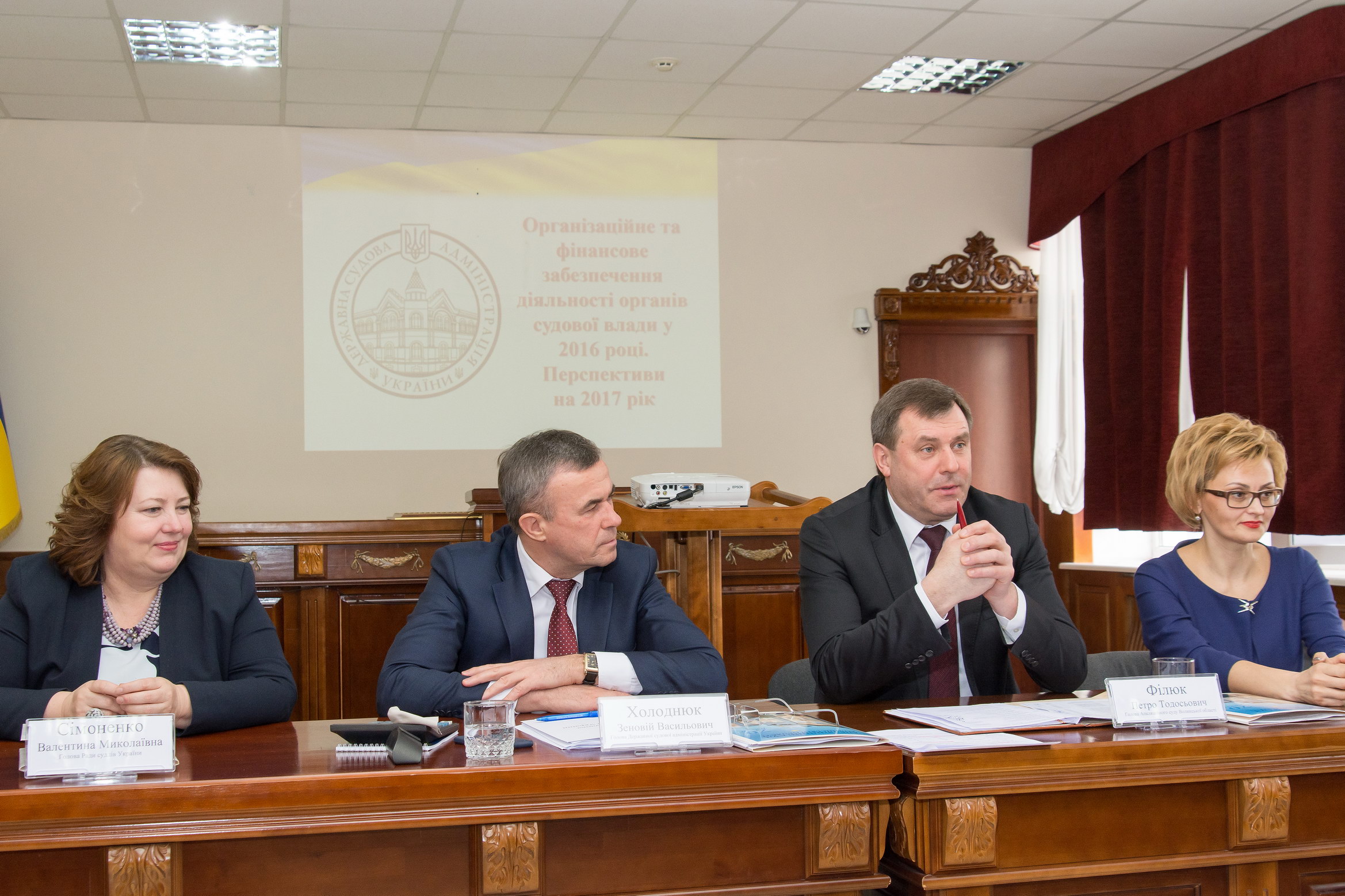 Голова ДСА України Зеновій Холоднюк довів до відома інформацію про стан матеріально-технічного забезпечення судової системи України у 2016 році у порівнянні з попереднім 2015 роком та перспективи на 2017 рік. Зазначив, що не може бути суд та судова влада незалежною, коли вона залежить від будь-кого фінансово.