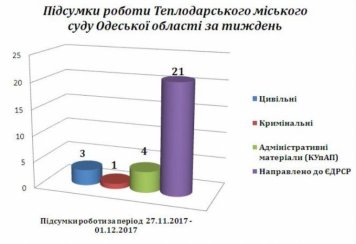 Так за період з 28 листопада по 01 грудня 2017 року Теплодарським міським судом Одеської області розглянуто: