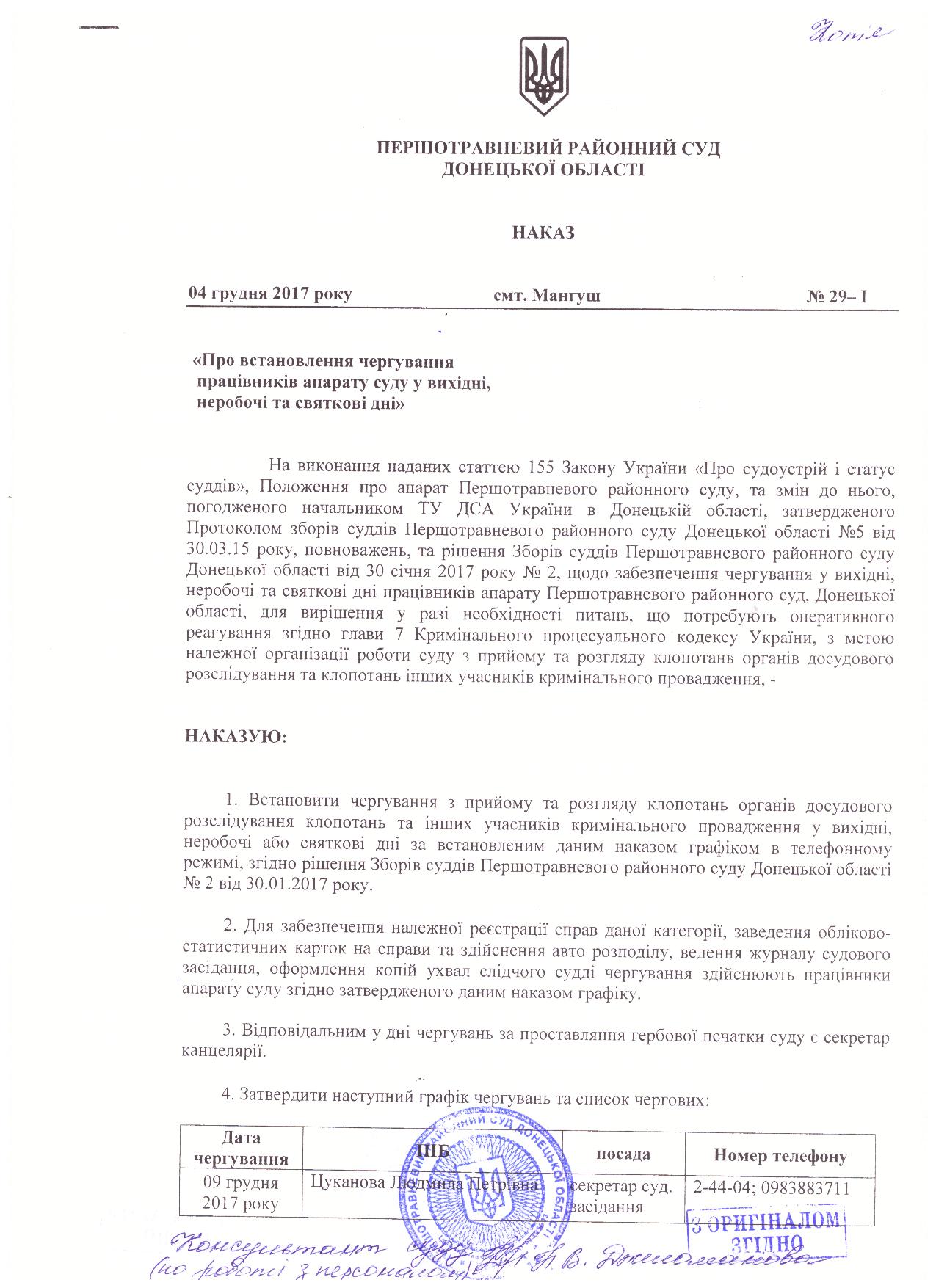Першотравневий районний суд Донецької області встановив чергування працівників апарату суду у вихідні, неробочі та святкові дні