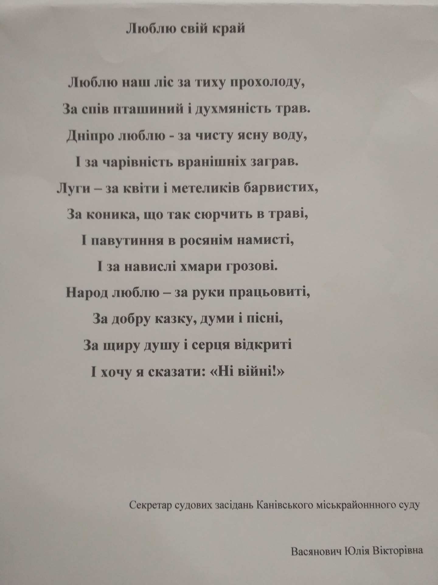 Також до виконання творчого завдання долучилися дорослі. Так, секретар судових засідань Канівського міськрайонного суду Юлія Васянович надіслала свій власний вірш.