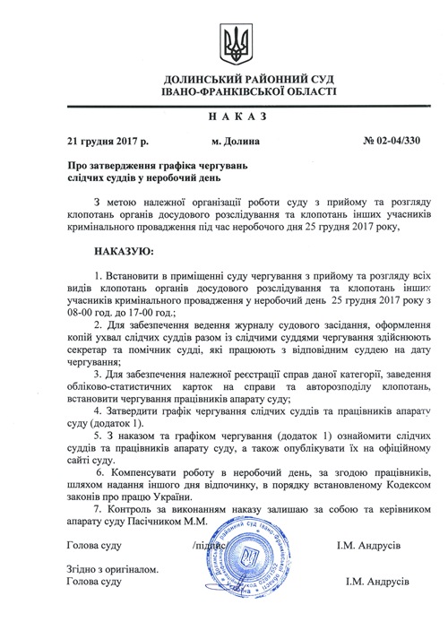 Долинський районний суд Івано-Франківської області оприлюднив графік чергування слідчих суддів в неробочий день
