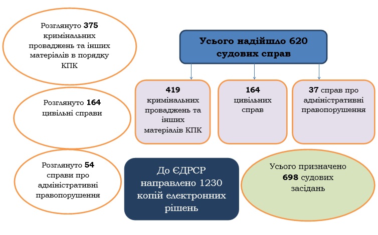 За вказаний період було всього призначено 698 судових засідань, з яких: 310 - у кримінальних провадженнях, 318 - у цивільних справах, 70 - у справах про адміністративні правопорушення.