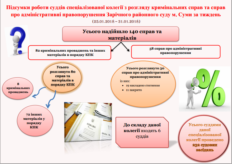 З метою здійснення контролю за станом розгляду справ головний спеціаліст по роботі зі зверненнями громадян та юридичних осіб Зарічного районного суду м. Суми Юлія Попович щотижня готує інформацію щодо призначення та розгляду справ суддями спеціалізованих колегій.