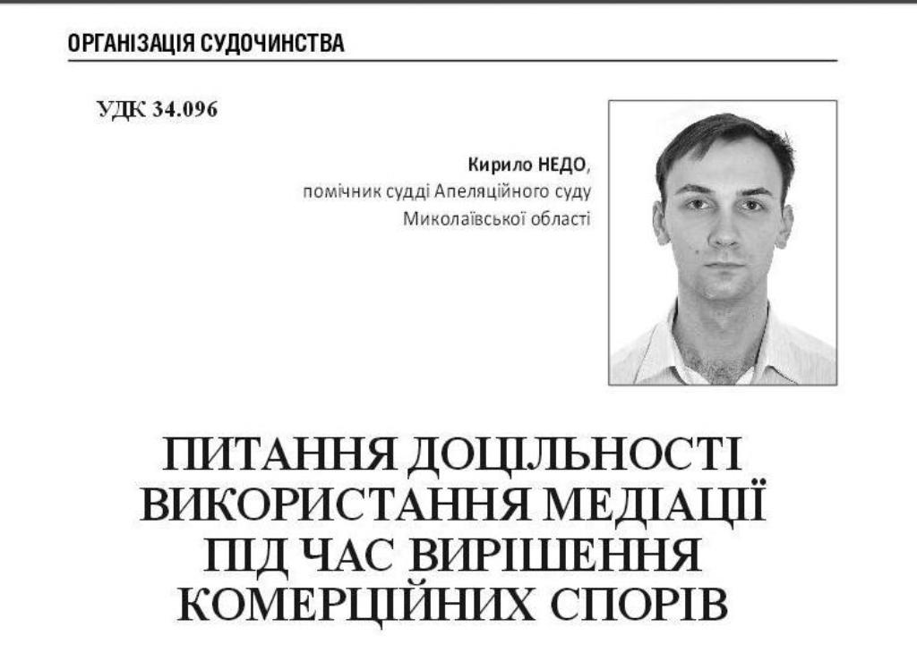 В якості автора однієї зі статтей збірки під назвою «Питання доцільності використання медіації під час вирішення комерційних спорів» виступив помічник апеляційного суду Миколаївської області Кирило Недо.
