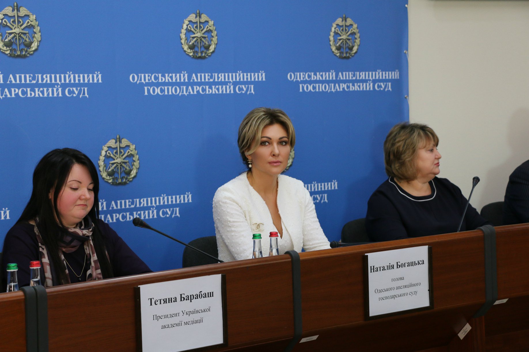 Наталія Богацька, голова Одеського апеляційного господарського суду, привітала всіх гостей заходу та зазначила, що медіація є дуже перспективним напрямом і має право на життя, тому суди будь-яким чином будуть цьому сприяти. Адже, саме медіація сприяє запобіганню конфліктів і їх вирішенню вже на ранніх стадіях, що це дозволяє не тільки заощаджувати грошові ресурси сторін спору, але й дозволить оптимізувати роботу суддів та знизити судове навантаження в усіх ланках судової системи.