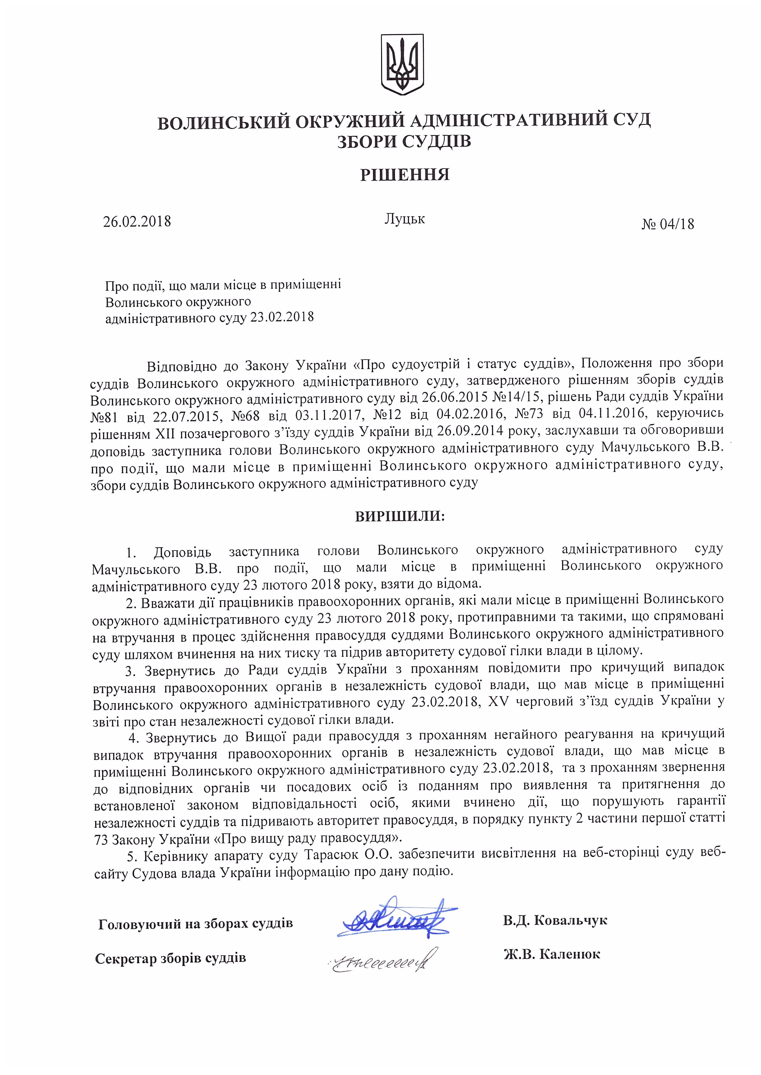 26 лютого 2018 року в приміщенні суду відбулись позачергові збори суддів Волинського окружного адміністративного суду, на яких було обговорено події, що мали місце в приміщенні Волинського окружного адміністративного суду 23 лютого 2018 року.