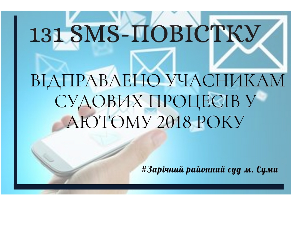 У лютому 2018 року Зарічним районним судом м. Суми надіслано учасникам судового процесу 131 повістку про виклик до суду у вигляді SMS-повідомлень. Усього з початку 2018 року – 251 судову повістку за допомогою SMS-повідомлень.