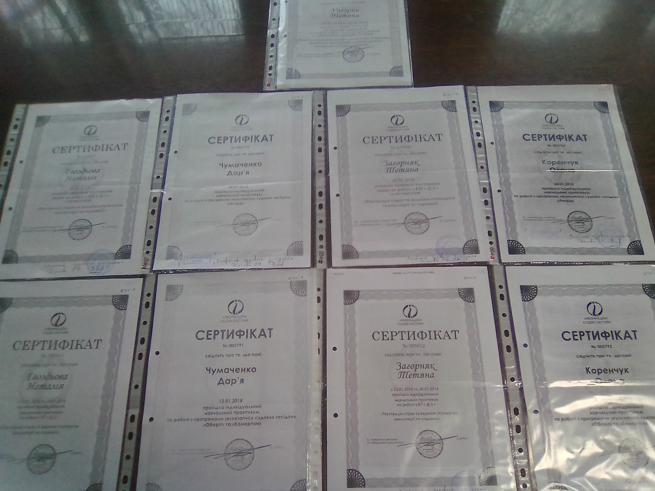 Секретар суду Гвоздьова Наталія та консультант суду Загорняк Тетяна з 22.01.2018 року по 26.01.2018 року пройшли індивідуальний навчальний практикум по роботі з комп’ютерною програмою «Д-3» за темою «Реєстрація справ та ведення статкарток (канцелярії по справах)». Після закінчення навчального практикуму вони також виявили бажання пройти тестування знань по роботі з КП «Д-3», по результатам якого отримали відмінні бали. Після проходження навчання та тестування дівчата отримали сертифікати.