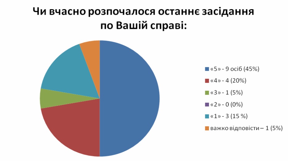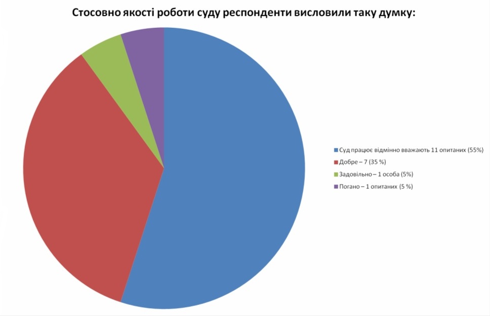 Підсумовуючи результати опитування повідомляємо, що у проведенні анкетування взяли участь 20 респондентів, середній вік яких становив: від 18-25 років – 2 особи (10 % опитаних), 26-39 років – 8 осіб, що складає 45 % від загальної кількості опитаних громадян, 40-59 – 7 чоловік (35 %), 60 років і старше – 3 особи (10%). Як вбачається з наведених статистичних даних найактивнішими відвідувачами суду були особи віком від 26-39 років. Із них: чоловіків – 9 (45 %), жінок – 11 (55 %). 18 опитаних людей проживає в населеному пункті, де розташований цей суд або 90 % опитаних. Особисто себе представляли у суді 9 осіб (45 %).