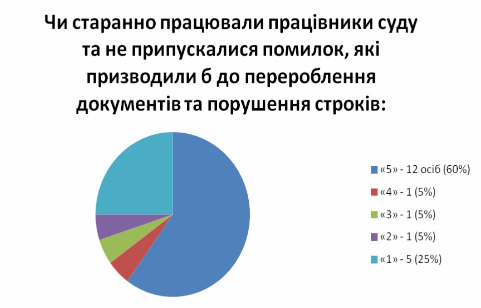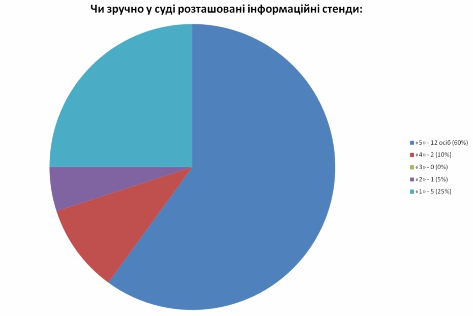 Підсумки анкетування свідчать, що респонденти в цілому задоволені організацією роботи суду, якістю та доступністю інформації для відвідувачів суду, умовами перебування у приміщенні суду.