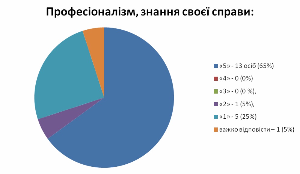 Щодо рівня освіти, то слід зауважити, що середню та неповну середню освіту мали 2 осіб, що складає 10 % від опитуваних, базову вищу – 1 (5 %), повну вищу – 17 осіб (85%). Вищу юридичну освіту мають 13 особи, що складає 65 % від кількості опитуваних.