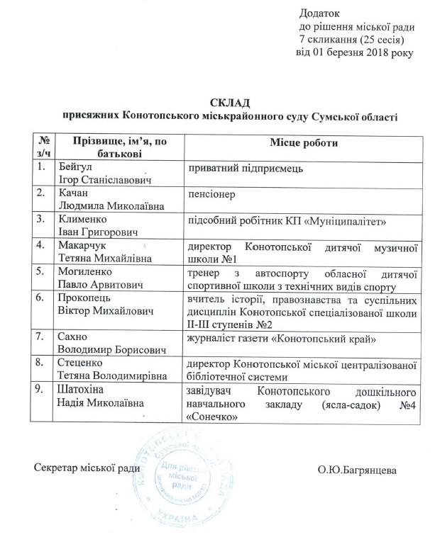 Конотопський міськрайонний суд Сумської області повідомляє, що рішенням двадцять п’ятої сесії сьомого скликання Конотопської міської ради від 01 березня 2018 року затверджено склад присяжних суду.