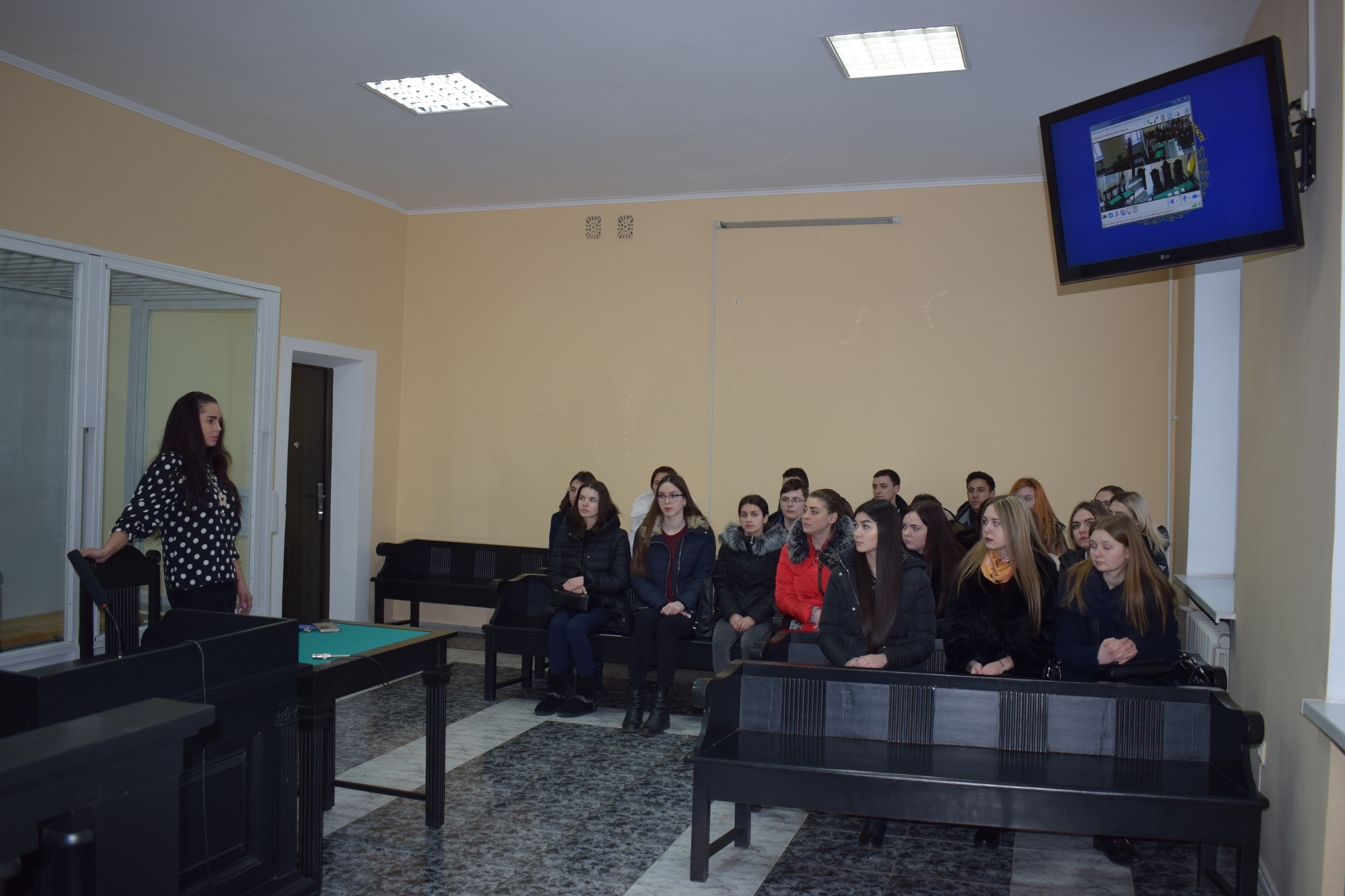 Зустріла студентів заступник керівника апарату суду Оксана Борисова, яка привітала майбутніх правників та розповіла про Інформаційний центр суду, в якому можна не тільки дізнатися про стан розгляду справ, дату та час призначеного судового засідання, результати розгляду апеляційної скарги, а й отримати копії судових рішень та іншу інформацію. Крім того, кожен відвідувач суду може скористатися послугою безкоштовної підзарядки мобільних телефонів та портативних пристроїв, а також підключитися до мережі інтернет за допомогою вільного WI-FI.